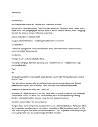 Pantas sahaja tanganku menarik langsir yang menutupi jendela ituKuliarkan pandangan ku ke luar rumah yang masih lagi gelap tanpa cahaya sang mentari pagi. Manalah orang tahu mak carilahjawabku laju. Sungguh mendamaikan semua masaalah terasa hanyut bersama ombak yang menerjang pasir pantai.